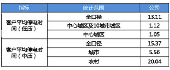 2018年公司客戶平均停電時間(低壓)為13.11小時/戶,同比下降34.7%。 中心城區及10城市城區客戶平均停電時間(低壓)為1.12小時/戶,同比下降53.9%;公司客戶平均停電時間(中壓)完成值為15.37小時/戶,同比下降9.3%,其中城市和農村客戶平均停電時間(中壓)分別為5.56小時/戶和20.04小時/戶。
