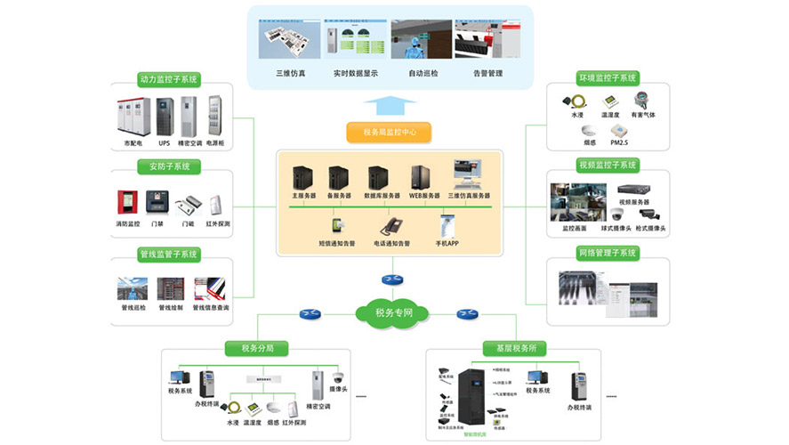對機房內的各類監控對象(包括有:UPS電源、UPS蓄電池組、發電機設備、交流配電柜、列頭柜、機房空調、新風系統、火災報警系統、有毒氣體檢測、門禁系統、攝像頭、水浸、溫濕度、網絡設備、服務器設備、數據庫等)進行實時監控,打破各系統間的系統壁壘,將各類監控對象、監控信息進行整合,在統一的監控平臺上進行管理,實現集中監控,分級管理,消除各自為政、信息孤島。
